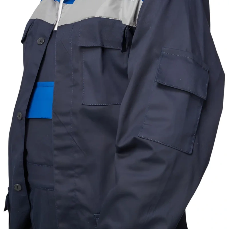 Куртка также имеет прямой силуэт и оснащена объемными накладными карманами, что позволяет хранить необходимые мелочи и инструменты под рукой. Супатная застежка на пуговицы обеспечивает надежное закрытие и защиту от ветра. Куртка выполнена в сочетании синего и василькового цветов, что придает ей современный и стильный вид.
