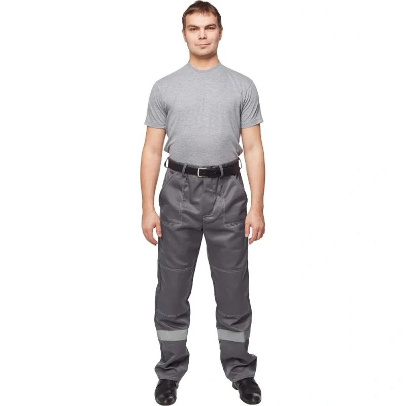 Брюки оснащены центральной застежкой на молнии и пуговицей по поясу. На поясе расположены шлевки для ремня. На брюках расположены два накладных кармана с наклонным входом. Дополнительные наколенники из основной ткани, для увеличения срока службы. Светоотражающая лента шириной 50 мм настрочена по низу брюк.