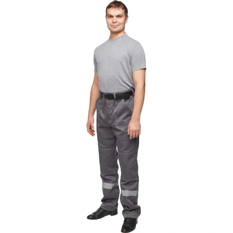 Брюки оснащены центральной застежкой на молнии и пуговицей по поясу. На поясе расположены шлевки для ремня. На брюках расположены два накладных кармана с наклонным входом. Дополнительные наколенники из основной ткани, для увеличения срока службы. Светоотражающая лента шириной 50 мм настрочена по низу брюк.