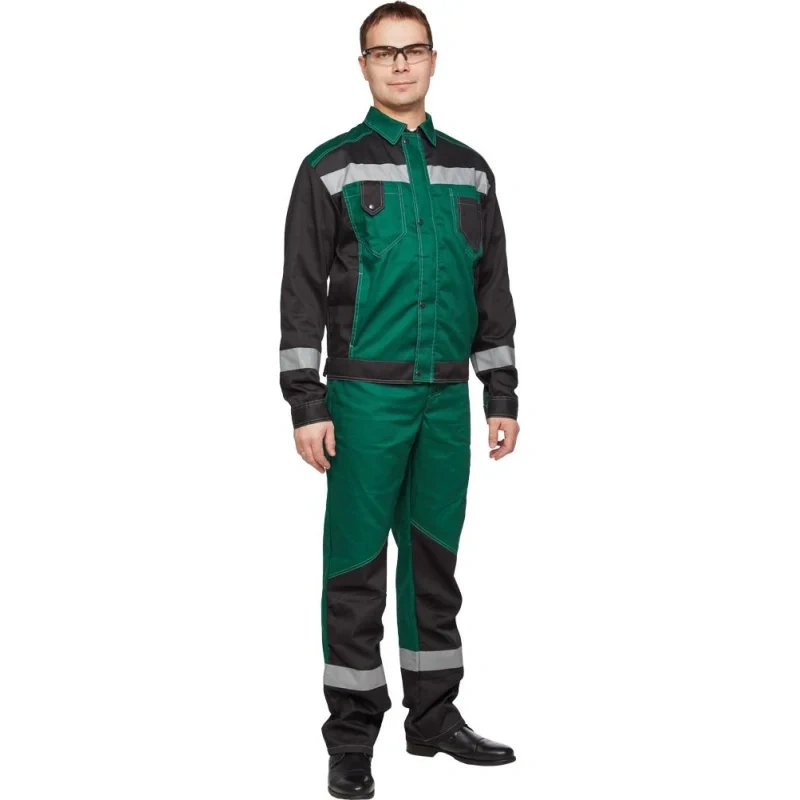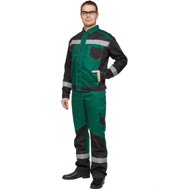 Костюм рабочий летний мужской л21-КПК КОС212 с СОП зеленый/черный (размер 52-54, рост 170-176). Коллекция спецодежды л21 представляет собой надежное решение для защиты от общих производственных загрязнений и от механических повреждений, от истирания. Костюм мужской л21-КПК состоит из куртки и полукомбинезона. Идеально подходит для использования в сельском хозяйстве, логистике, легкой и тяжелой промышленности, а также в строительстве. Костюм изготовлен из смесовой ткани с водоотталкивающей пропиткой (ВО), состоящей на 65% из полиэстера и на 35% из хлопка. Плотность материала составляет 235 г/кв.м. Такая комбинация обеспечивает высокую износостойкость и комфорт при носке. Материал не имеет специальной пропитки, но его структура обеспечивает достаточную защиту от загрязнений. Защитные свойства: защита от общих производственных загрязнений. Куртка имеет прямой силуэт и регулируется по фигуре с помощью кнопок на поясе. Застегивается на молнию и кнопки. На куртке два верхних накладных кармана. Рукава снабжены налокотниками и манжетами, что повышает комфорт и долговечность изделия. Полукомбинезон также имеет прямой силуэт и застегивается на пуговицы. Впереди расположены два накладных кармана со скошенным входом и один верхний накладной карман. Сзади полукомбинезон имеет два накладных кармана, один из которых на кнопке, а также боковой накладной карман на кнопке. Светоотражающие полосы шириной 50 мм размещены на груди, спине, рукавах и внизу полукомбинезона, обеспечивая хорошую видимость в условиях недостаточной освещенности. Рекомендации по уходу: для продления срока службы изделия рекомендуется соблюдать инструкции по стирке и уходу, указанные на этикетке. Стандарты: ГОСТ 12.4.280-2014, ТР ТС 019/2011. Коллекция спецодежды Премиум-класса л21 выполнена в стильном, функциональном дизайне, в широкой цветовой гамме. Костюмы, представленные в ней, предназначены для защиты от общих производственных загрязнений и от механических повреждений, от истирания. Рекомендуется для инженерно-технических работников.