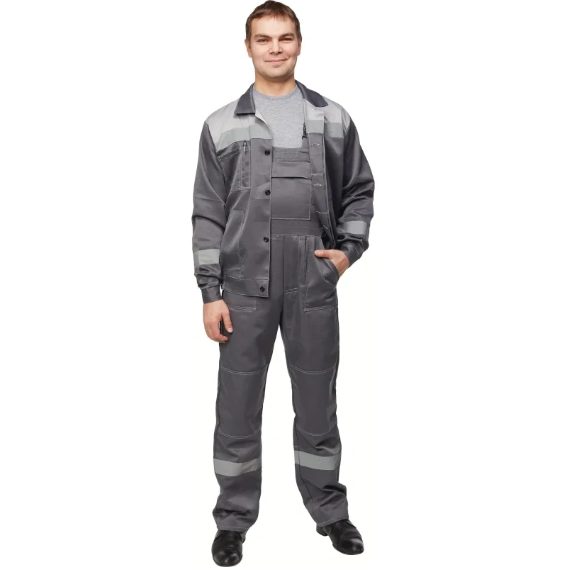 Костюм собран нитками серого цвета в тон ткани и отделочные строчки выполнены светло-серого цвета с двойной строчкой, что повышает прочность швов и придает изделию аккуратный внешний вид. Светоотражающая полоса шириной 50 мм размещена на груди, спине, рукавах и внизу полукомбинезона, что обеспечивает высокую видимость и безопасность работника в условиях недостаточной освещенности.Уход и стандарты