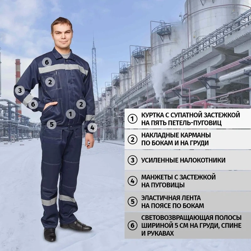 Костюм изготовлен из смесовой ткани, состоящей на 80% из полиэстера и на 20% из хлопка, с плотностью материала 210 г/кв.м. Эта ткань сочетает в себе прочность полиэстера и комфорт хлопка, обеспечивая высокую износостойкость и долговечность изделия. Костюм выполнен в темно-синем цвете, что придает ему строгий и практичный вид.