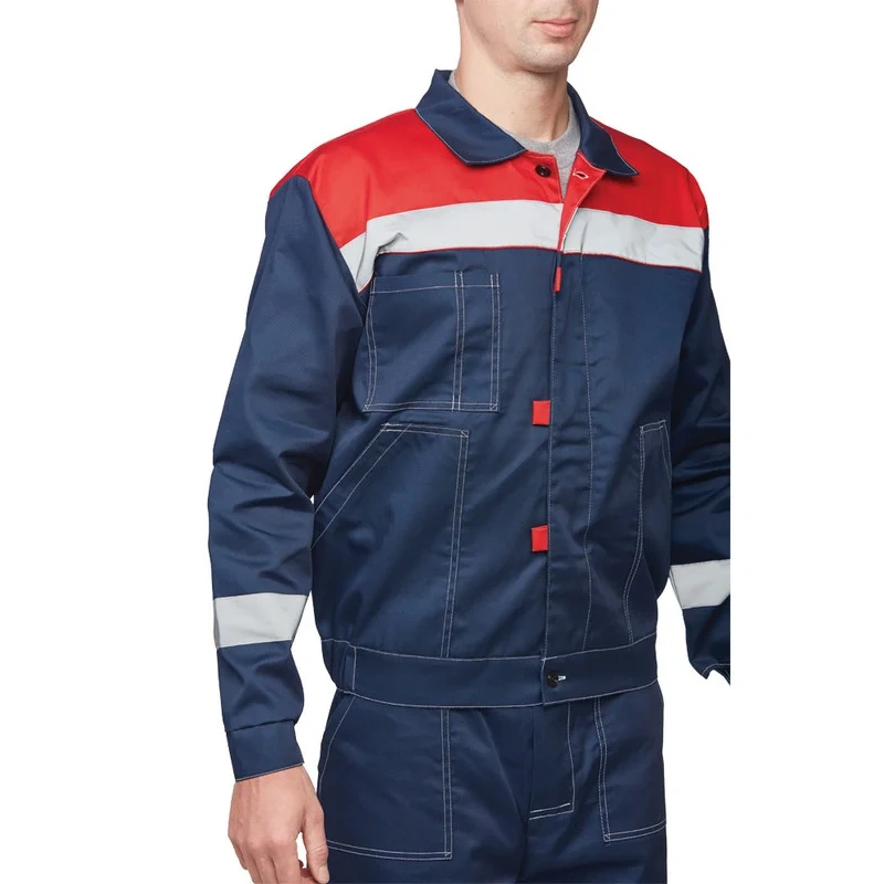 Куртка с эластичной лентой по бокам имеет прямой силуэт, что обеспечивает свободу движений и комфорт при носке. Застёжка потайная на петлях и пуговицах. Верхняя и нижняя пуговицы на сквозных петлях. Воротник отложной. На куртке предусмотрены три накладных кармана: один нагрудный накладной двухсекционный, два нижних накладных с наклонным входом. Регулировка ширины манжет рукава при помощи пуговиц. Рукава выполнены с дополнительными налокотниками из основной ткани, для увеличения срока службы куртки. Светоотражающая лента шириной 50 мм расположена по кокеткам полочки, спинки, а также на рукавах.