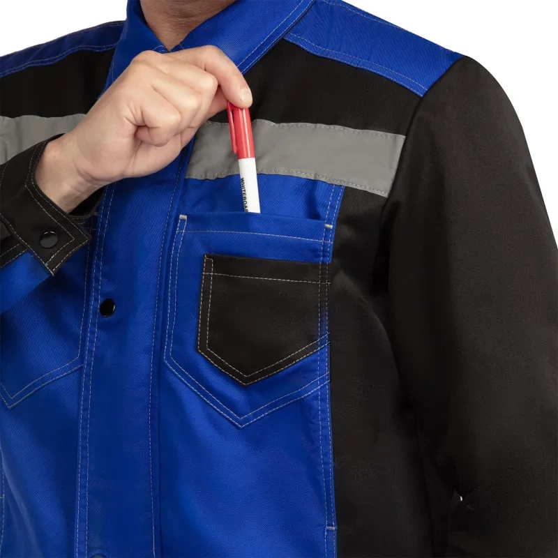 Костюм рабочий летний мужской л21-КПК КОС212 с СОП васильковый/черный (размер 56-58, рост 182-188). Коллекция спецодежды л21 представляет собой надежное решение для защиты от общих производственных загрязнений и от механических повреждений, от истирания. Костюм мужской л21-КПК состоит из куртки и полукомбинезона. Идеально подходит для использования в сельском хозяйстве, логистике, легкой и тяжелой промышленности, а также в строительстве. Костюм изготовлен из смесовой ткани с водоотталкивающей пропиткой (ВО), состоящей на 65% из полиэстера и на 35% из хлопка. Плотность материала составляет 235 г/кв.м. Такая комбинация обеспечивает высокую износостойкость и комфорт при носке. Материал не имеет специальной пропитки, но его структура обеспечивает достаточную защиту от загрязнений. Защитные свойства: защита от общих производственных загрязнений. Куртка имеет прямой силуэт и регулируется по фигуре с помощью кнопок на поясе. Застегивается на молнию и кнопки. На куртке два верхних накладных кармана. Рукава снабжены налокотниками и манжетами, что повышает комфорт и долговечность изделия. Полукомбинезон также имеет прямой силуэт и застегивается на пуговицы. Впереди расположены два накладных кармана со скошенным входом и один верхний накладной карман. Сзади полукомбинезон имеет два накладных кармана, один из которых на кнопке, а также боковой накладной карман на кнопке. Светоотражающие полосы шириной 50 мм размещены на груди, спине, рукавах и внизу полукомбинезона, обеспечивая хорошую видимость в условиях недостаточной освещенности. Рекомендации по уходу: для продления срока службы изделия рекомендуется соблюдать инструкции по стирке и уходу, указанные на этикетке. Стандарты: ГОСТ 12.4.280-2014, ТР ТС 019/2011. Коллекция спецодежды Премиум-класса л21 выполнена в стильном, функциональном дизайне, в широкой цветовой гамме. Костюмы, представленные в ней, предназначены для защиты от общих производственных загрязнений и от механических повреждений, от истирания. Рекомендуется для инженерно-технических работников.
