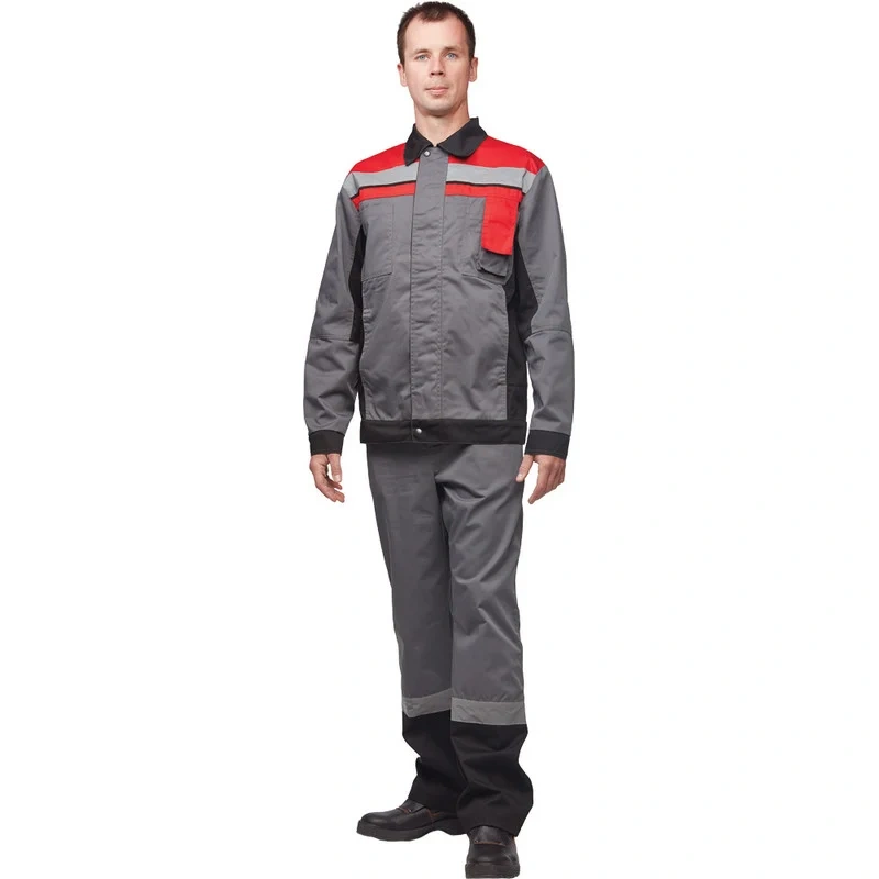 Костюм включает куртку и полукомбинезон черно-серого цвета с красной отделкой. Куртка оснащена центральной застежкой на молнию с ветрозащитной планкой, имеет нагрудные накладные карманы и нижние внутренние карманы. Полукомбинезон с боковой застежкой, снабжен эластичной тесьмой по талии для плотного прилегания. К брючинам комбинезона и кокетке куртки пришита светоотражающая полоса шириной 50 мм. Спецодежда изготовлена из смесовой ткани, состоящей на 65% из полиэфира и на 35% из хлопка.