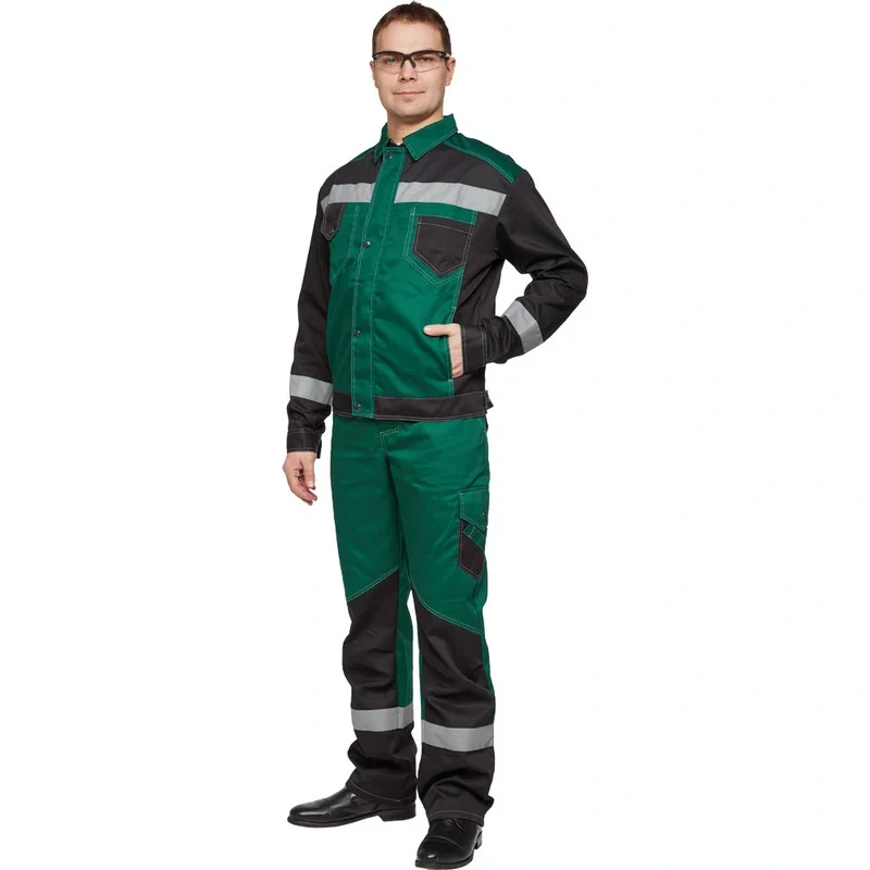 Спецодежда летняя костюм мужской л21-КБР состоит из куртки и брюк (размер 60-62, рост 182-188). Изготовлен из смесовой ткани (65% — полиэстер, 35% — хлопок) плотностью 240 г/кв.м с водоотталкивающей пропиткой (ВО). Светоотражающая полоса шириной 50 мм размещена на груди, спине, рукавах, а также внизу брюк. Куртка c застежкой на молнию и кнопки. На куртке два верхних накладных кармана. Рукава с налокотниками и манжетами. Ширина пояса куртки регулируется кнопками. Брюки прямого силуэта с застежкой на пуговицы. На передней половине брюк расположены два накладных кармана со скошенным входом. На брюках сзади 2 накладных кармана, один из которых на кнопке, а также боковой накладной карман на кнопке. Весь костюм сшит контрастными нитками белого цвета, двойной строчкой. Костюм предназначен для защиты от общих производственных загрязнений и от механических повреждений, от истирания. ГОСТ 12.4.280-2014, ТР ТС 019/2011. Сферы применения: сельское хозяйство, логистика, легкая промышленность, строительство, тяжелая промышленность.Коллекция рабочей одежды л21 представлена двумя видами комплектов: куртка и полукомбинезон л21-КПК и куртка и брюки Л21-КБР.