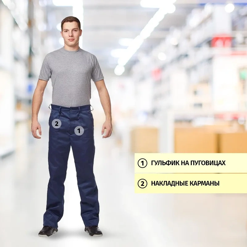 Брюки выполнены в прямом силуэте. Застежка гульфика брюк на петлях и пуговицах, пуговица по поясу. На поясе расположены шлевки для ремня. На брюках расположены два накладных кармана с наклонным входом. Световозвращающая лента шириной 50 мм настрочена по низу брюк.