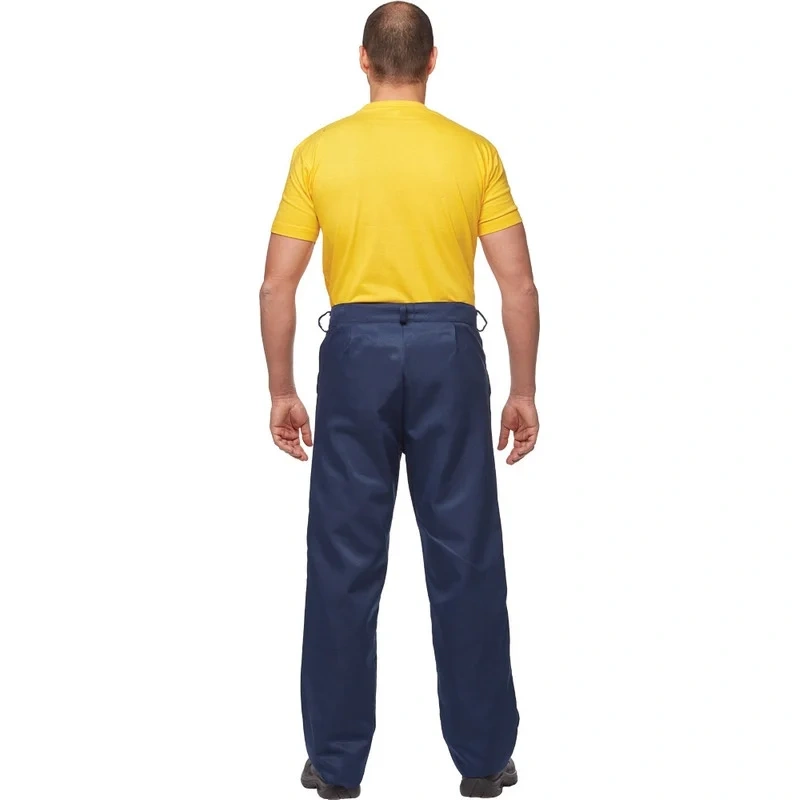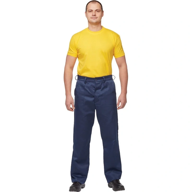 Брюки выполнены в прямом силуэте. Застежка гульфика брюк на петлях и пуговицах, пуговица по поясу. На поясе расположены шлевки для ремня. На брюках расположены два накладных кармана с наклонным входом. Световозвращающая лента шириной 50 мм настрочена по низу брюк.