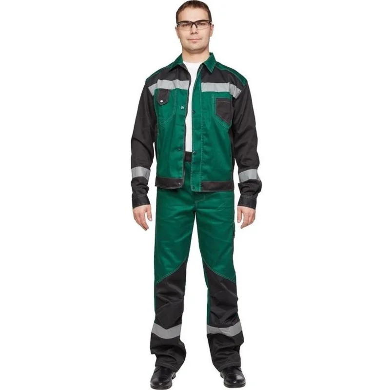 Спецодежда летняя костюм мужской л21-КБР состоит из куртки и брюк (размер 64-66, рост 170-176). Изготовлен из смесовой ткани (65% — полиэстер, 35% — хлопок) плотностью 240 г/кв.м с водоотталкивающей пропиткой (ВО). Светоотражающая полоса шириной 50 мм размещена на груди, спине, рукавах, а также внизу брюк. Куртка c застежкой на молнию и кнопки. На куртке два верхних накладных кармана. Рукава с налокотниками и манжетами. Ширина пояса куртки регулируется кнопками. Брюки прямого силуэта с застежкой на пуговицы. На передней половине брюк расположены два накладных кармана со скошенным входом. На брюках сзади 2 накладных кармана, один из которых на кнопке, а также боковой накладной карман на кнопке. Весь костюм сшит контрастными нитками белого цвета, двойной строчкой. Костюм предназначен для защиты от общих производственных загрязнений и от механических повреждений, от истирания. ГОСТ 12.4.280-2014, ТР ТС 019/2011. Сферы применения: сельское хозяйство, логистика, легкая промышленность, строительство, тяжелая промышленность.Коллекция рабочей одежды л21 представлена двумя видами комплектов: куртка и полукомбинезон л21-КПК и куртка и брюки Л21-КБР.