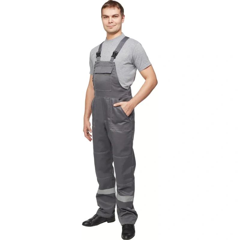 Прямого силуэта, с застежкой в среднем шве передних половинок (гульфик) на молнию. Боковая застежка на петли и пуговицы. Наколенники обеспечивают дополнительную защиту и удобство при работе в коленно-локтевом положении. Два накладных кармана со скошенным входом на передней половинке полукомбинезона позволяют удобно размещать инструменты и материалы.Отделка и безопасность