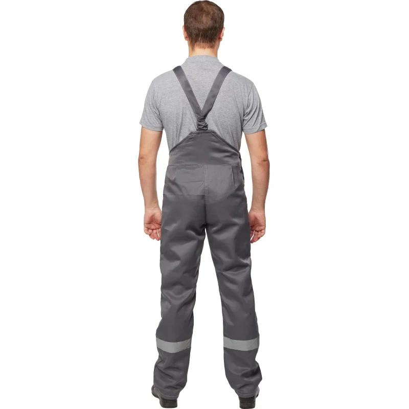 Костюм собран нитками серого цвета в тон ткани и отделочные строчки выполнены светло-серого цвета с двойной строчкой, что повышает прочность швов и придает изделию стильный вид. Светоотражающая полоса шириной 50 мм размещена на груди, спине, рукавах и внизу полукомбинезона, обеспечивая высокую видимость и безопасность работника в условиях недостаточной освещенности.Уход и стандарты