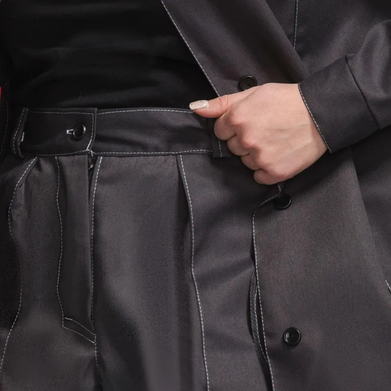 Брюки оснащены центральной застёжкой на молнии и пуговицей по поясу. На поясе расположены шлёвки для ремня. На брюках расположены два накладных кармана с наклонным входом. Дополнительные наколенники из основной ткани, для увеличения срока службы. Светоотражающая лента шириной 50 мм настрочена по низу брюк.
