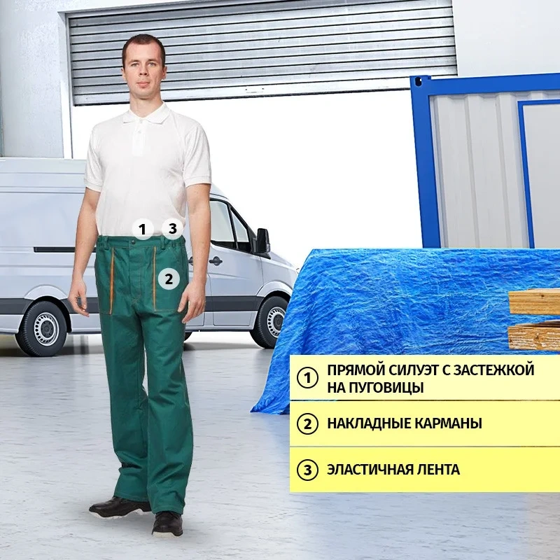 Брюки оснащены центральной застежкой на молнии и пуговицей по поясу, на поясе расположены шлевки для ремня. На брюках есть два накладных кармана с наклонным входом. Дополнительные наколенники из основной ткани увеличивают срок службы. Светоотражающая лента шириной 50 мм настрочена по низу брюк.