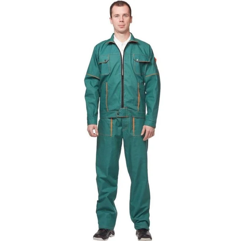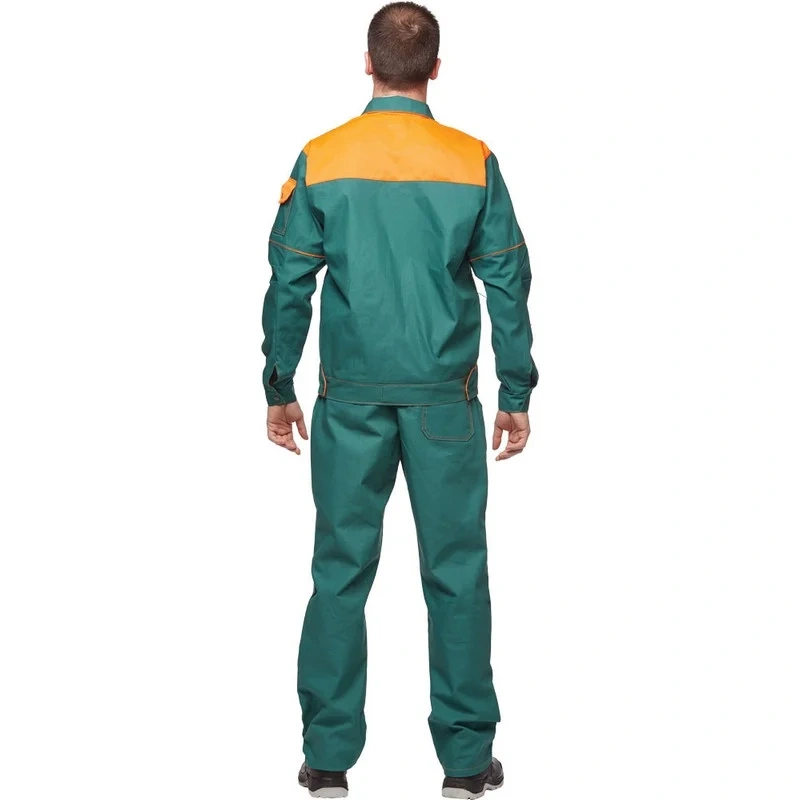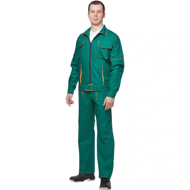 Куртка с эластичной лентой по бокам имеет прямой силуэт, обеспечивающий свободу движений и комфорт при носке. Застежка потайная на петлях и пуговицах, верхняя и нижняя пуговицы расположены на сквозных петлях. Воротник отложной. На куртке расположены три накладных кармана: один нагрудный двухсекционный и два нижних с наклонным входом. Манжеты регулируются при помощи пуговиц. Рукава дополнены налокотниками из основной ткани для увеличения срока службы. Светоотражающая лента шириной 50 мм размещена по кокеткам полочки, спинки и на рукавах.