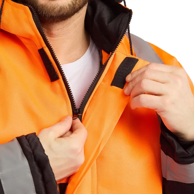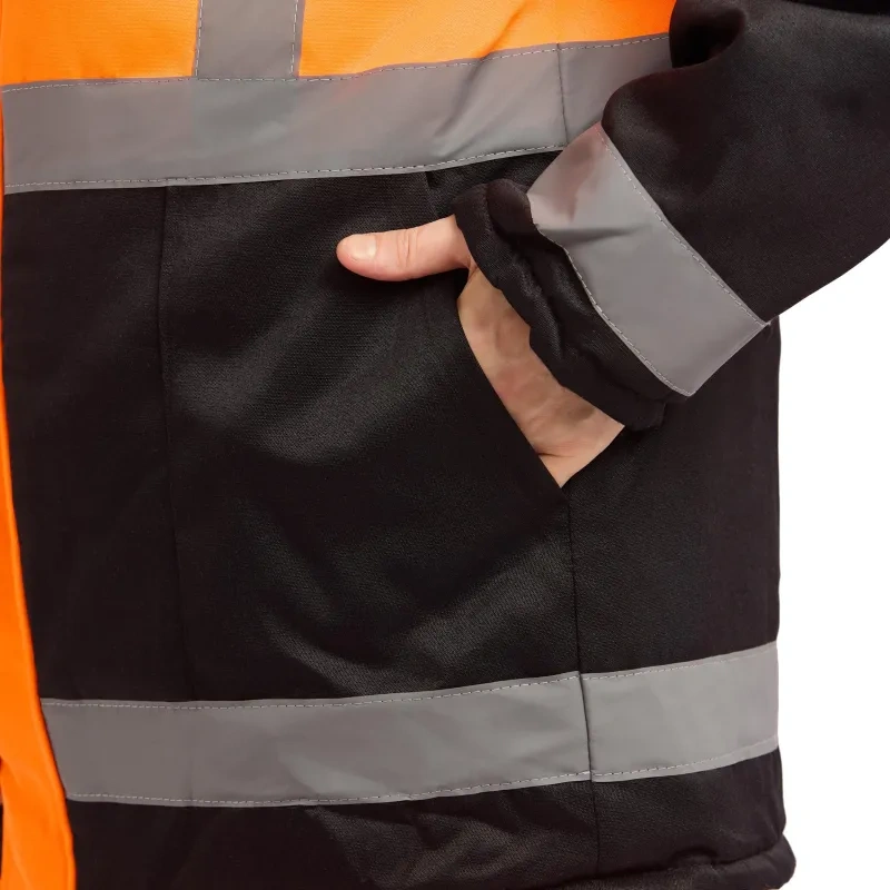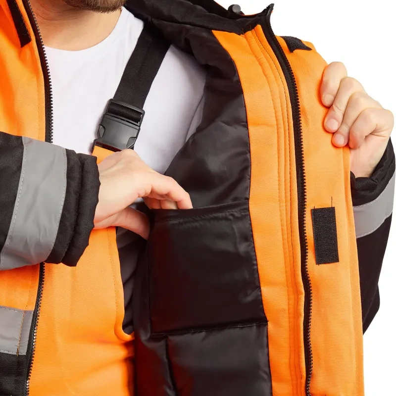 Костюм сигнальный зимний с полукомбинезоном зд01-КПК оранжевый/черный с СОП (размер 48-50, рост 170-176). Костюм ЗД01-КПК состоит из куртки и полукомбинезона, предназначен для работы в сферах энергетики, нефтегазовой промышленности, логистики, тяжелой промышленности, строительства, ЖКХ, озеленения и автомобильной промышленности. Он обеспечивает высокую видимость и защиту от пониженных температур, а также от общих производственных загрязнений. Костюм выполнен из смесовой ткани Грета, состоящей на 80% из полиэстера и 20% из хлопка, плотность ткани - 190 г/кв.м. Ткань имеет водоотталкивающую пропитку. Подкладка выполнена из полиэстера.Утеплитель костюма - синтепон с плотностью 360 г/кв.м. Технология изготовления термоскрепленного синтепона (евросинтепона) позволяет использовать данный утеплитель для создания более тонких изделий с сохранением термозащитных свойств. Важными преимуществами утеплителя являются легкость и хорошая пластичность, что улучшает подвижность в костюме. А также исключение миграции волокна через ткани верха и подкладки за счет скрепления слоев.Защитные свойства:- Ми - защита от механических воздействий: истирания;- З - защита от общих производственных загрязнений;- Защита от пониженных температур. Тип силуэта - прямой, костюм не стесняет движения. Он имеет индивидуальную регулировку по фигуре с помощью ремня и шлевок. В костюме предусмотрены врезные карманы с молниями и дополнительные внутренние карманы. Застежка молния. Воротник - стойка, застежка молния. Сигнальные элементы - полоса для повышения видимости. Две вертикальные и 2 горизонтальные полосы расположены на груди костюма, две вертикальные и две горизонтальные на спине, две горизонтальные и две вертикальные на рукавах и две горизонтальные полосы на брючинах. Ширина полосы: 50 мм. Рекомендации по уходу: стирка при температуре не выше 40С, деликатная сушка.Костюм соответствует стандартам ГОСТ 12.4.303-2016 и ТР ТС 019/2011.<a href='https://www.komus.ru/news/spravochnik-pokupatelya/vybor-razmera-spetsodezhdy/n/15/' target='_blank'>Подобрать размерЦвет на изображении товара в интернет-магазине или в печатном каталоге может отличаться от оригинала из-за особенностей цветопередачи монитора.