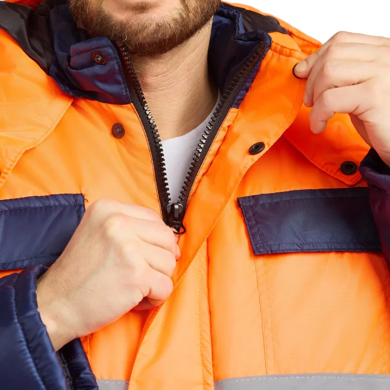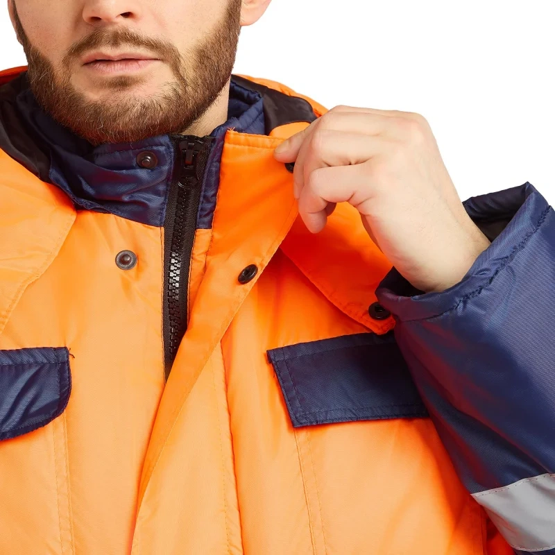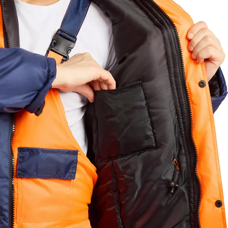 Костюм сигнальный зимний с полукомбинезоном Спектр-2-КПК оранжевый/синий с СОП (размер 48-50, рост 170-176). Состоит из куртки и полукомбинезона, предназначен для работы в условиях повышенной видимости и защиты от низких температур. Он используется в сфере озеленения, строительства и логистики, а также в других областях, где важна видимость и защита от внешних воздействий. Костюм выполнен из синтетической ткани Оксфорд с водоотталкивающей пропиткой. Состав ткани - 100% полиэстер, плотность материала 85 г/кв.м. Подкладка выполнена из нейлона. Утеплитель костюма - синтепон, плотность 360 г/кв.м. Технология изготовления термоскрепленного синтепона (евросинтепона) позволяет использовать данный утеплитель для создания более тонких изделий с сохранением термозащитных свойств. Важными преимуществами утеплителя являются легкость и хорошая пластичность, что улучшает подвижность в костюме. А также исключение миграции волокна через ткани верха и подкладки за счет скрепления слоев.Защитные свойства:- Ми - защита от механических воздействий: истирания;- З - защита от общих производственных загрязнений;- Защита от пониженных температур. Тип силуэта - прямой, не стесняет движений. В костюме предусмотрена индивидуальная регулировка по фигуре с помощью шлевок и ремня. Эластичные вставки обеспечивают дополнительный комфорт и свободу движений. Костюм оснащен врезными карманами с молниями и дополнительными внутренними карманами. Застежка молния, воротник - стойка с застежкой на молнии. Сигнальные элементы включают полосу для повышения видимости, расположенную на куртке и полукомбинезоне. Полоса расположена на груди и спине костюма, снизу куртки (спереди и сзади), две полосы на рукавах и две на брючинах. Ширина полосы: 50 мм. В костюме также предусмотрены ветрозащитные планки и усиленные швы для повышения износостойкости. Рекомендации по уходу: стирка при температуре не выше 40С, деликатная сушка.Костюм соответствует стандартам ГОСТ 12.4.281-2021, ГОСТ 12.4.303-2016 и ТР ТС 019/2011, что гарантирует безопасность и долговечность изделия.<a href='https://www.komus.ru/news/spravochnik-pokupatelya/vybor-razmera-spetsodezhdy/n/15/' target='_blank'>Подобрать размерЦвет на изображении товара в интернет-магазине или в печатном каталоге может отличаться от оригинала из-за особенностей цветопередачи монитора.