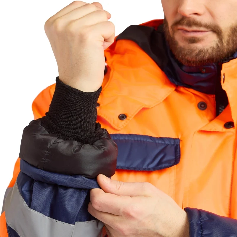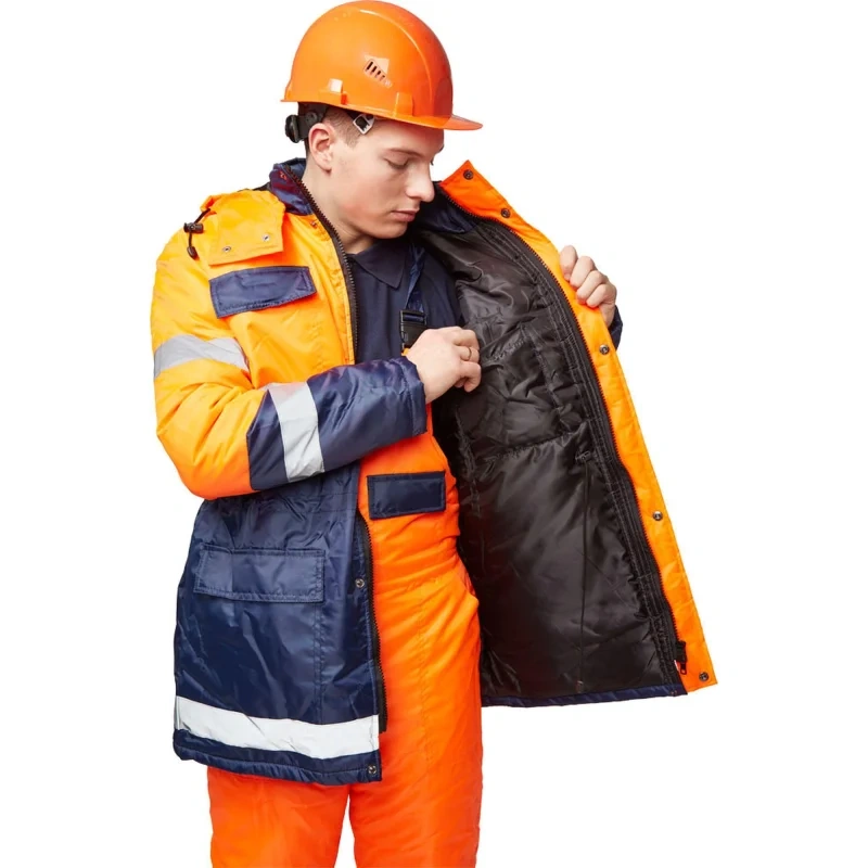 Костюм сигнальный зимний с полукомбинезоном Спектр-2-КПК оранжевый/синий с СОП (размер 56-58, рост 170-176). Костюм Спектр-2-КПК состоит из куртки и полукомбинезона, предназначен для работы в условиях повышенной видимости и защиты от низких температур. Он используется в сфере озеленения, строительства и логистики, а также в других областях, где важна видимость и защита от внешних воздействий. Костюм выполнен из синтетической ткани Оксфорд с водоотталкивающей пропиткой. Состав ткани - 100% полиэстер, плотность материала 85 г/кв.м. Подкладка выполнена из нейлона. Утеплитель костюма - синтепон, плотность 360 г/кв.м. Технология изготовления термоскрепленного синтепона (евросинтепона) позволяет использовать данный утеплитель для создания более тонких изделий с сохранением термозащитных свойств. Важными преимуществами утеплителя являются легкость и хорошая пластичность, что улучшает подвижность в костюме. А также исключение миграции волокна через ткани верха и подкладки за счет скрепления слоев.Защитные свойства:- Ми - защита от механических воздействий: истирания;- З - защита от общих производственных загрязнений;- Защита от пониженных температур. Тип силуэта - прямой, не стесняет движений. В костюме предусмотрена индивидуальная регулировка по фигуре с помощью шлевок и ремня. Эластичные вставки обеспечивают дополнительный комфорт и свободу движений. Костюм оснащен врезными карманами с молниями и дополнительными внутренними карманами. Застежка молния, воротник - стойка с застежкой на молнии. Сигнальные элементы включают полосу для повышения видимости, расположенную на куртке и полукомбинезоне. Полоса расположена на груди и спине костюма, снизу куртки (спереди и сзади), две полосы на рукавах и две на брючинах. Ширина полосы: 50 мм. В костюме также предусмотрены ветрозащитные планки и усиленные швы для повышения износостойкости. Рекомендации по уходу: стирка при температуре не выше 40С, деликатная сушка.Костюм соответствует стандартам ГОСТ 12.4.281-2021, ГОСТ 12.4.303-2016 и ТР ТС 019/2011, что гарантирует безопасность и долговечность изделия.<a href='https://www.komus.ru/news/spravochnik-pokupatelya/vybor-razmera-spetsodezhdy/n/15/' target='_blank'>Подобрать размерЦвет на изображении товара в интернет-магазине или в печатном каталоге может отличаться от оригинала из-за особенностей цветопередачи монитора.