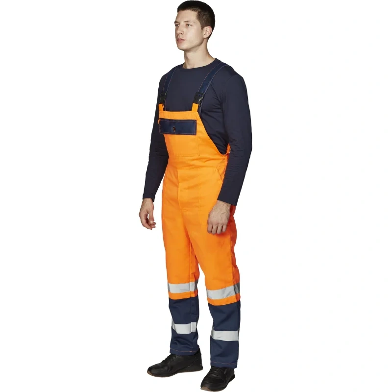 Полукомбинезон с регулируемыми бретелями и пряжками. Брюки имеют накладные карманы с косым входом и задний накладной карман. В области талии сзади вшита резинка. Низ брючин синего цвета с нашитыми сигнальными полосами шириной 5 см. Гульфик застегивается на супатную застежку с 3 пуговицами.