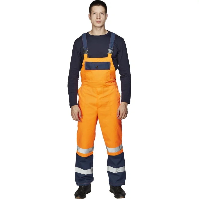 Полукомбинезон с регулируемыми бретелями и пряжками. Брюки имеют накладные карманы с косым входом и задний накладной карман. В области талии сзади вшита резинка. Низ брючин синего цвета с нашитыми сигнальными полосами шириной 5 см. Гульфик застегивается на супатную застежку с 3 пуговицами.