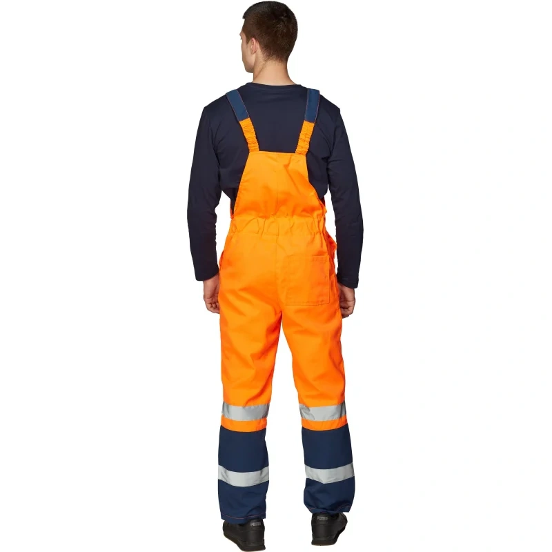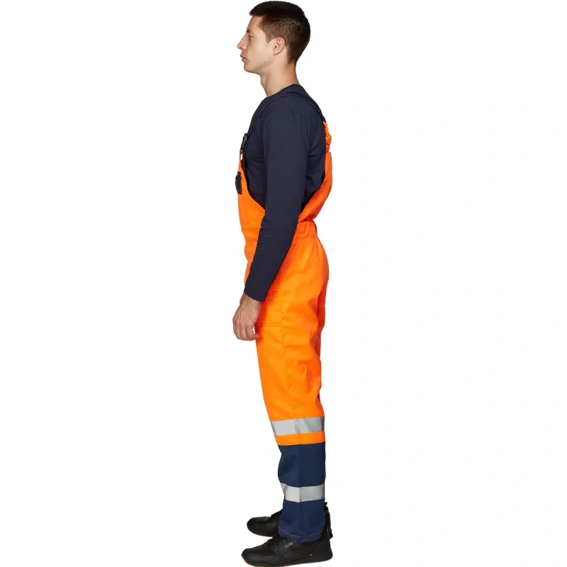 Полукомбинезон с регулируемыми бретелями и пряжками. Брюки имеют накладные карманы с косым входом и задний накладной карман. В области талии сзади вшита резинка. Низ брючин синего цвета с нашитыми сигнальными полосами шириной 5 см. Гульфик застегивается на супатную застежку с 3 пуговицами.