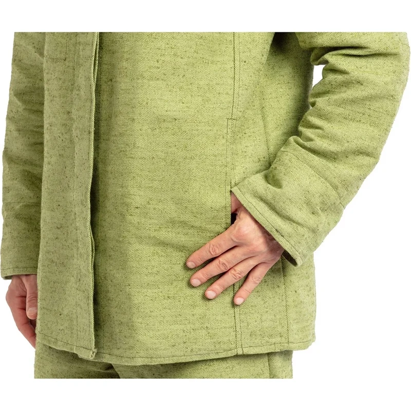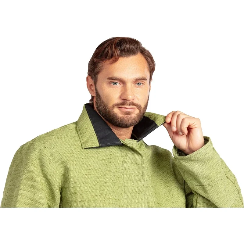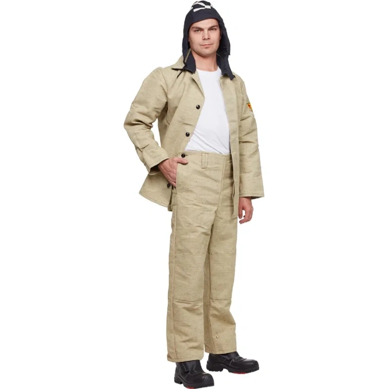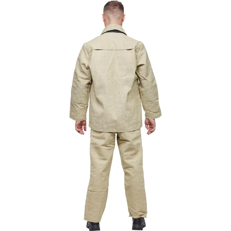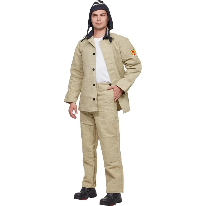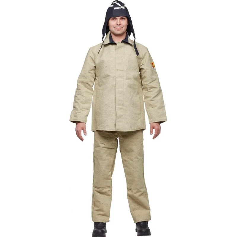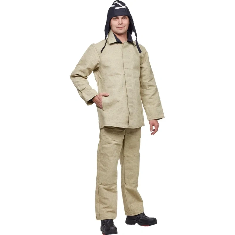Костюм изготовлен из брезента с огнестойкой пропиткой, плотность ткани составляет 520 г/кв.м. Материал гипоаллергенен и обладает высокой прочностью на разрыв, надёжно защищая от брызг расплавленного металла и окалины.