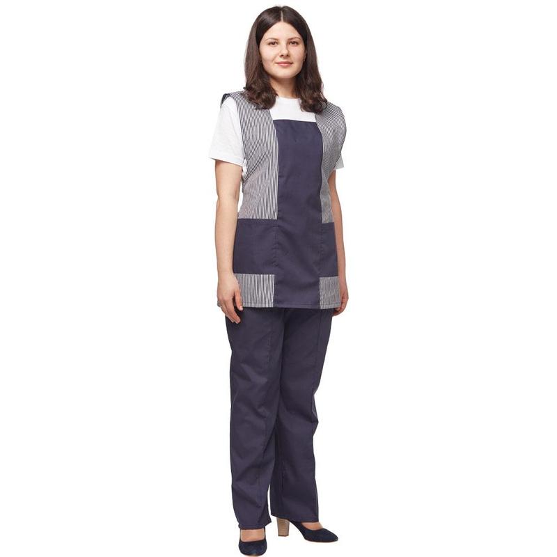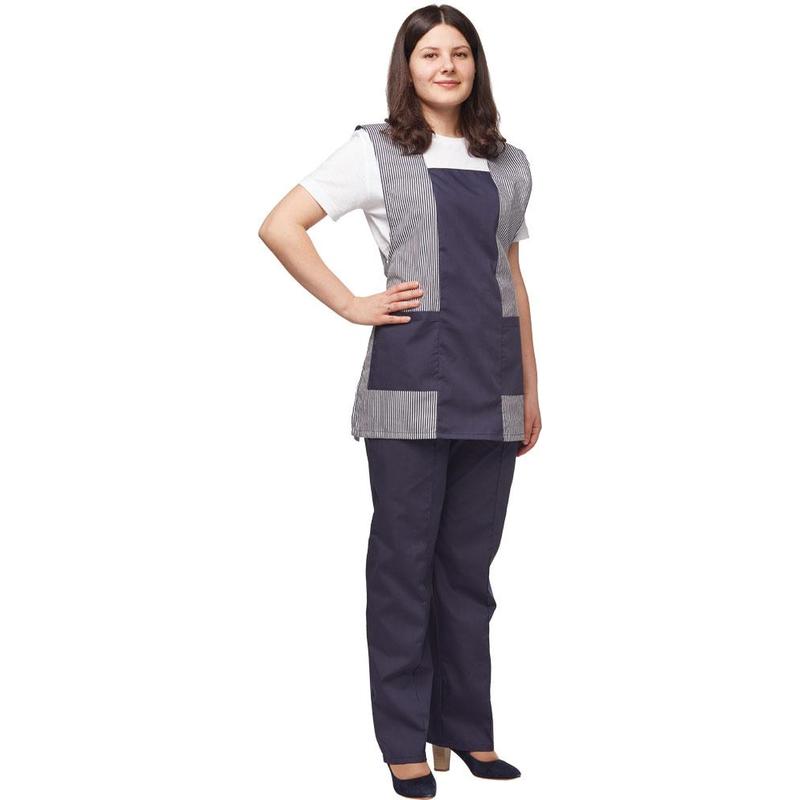 Костюм для горничных и уборщиц у08-СБР, цвет синий (размер 48-50, рост 170-176), включает фартук-сарафан и брюки. Фартук с накладными карманами, по талии регулируется боковыми завязками. Отделка — вставки контрастного цвета. Размер накладных карманов — 17x17 см. Брюки умеренного объема на резинке с отстроченной стрелкой. Женский костюм изготовлен из смесовой ткани Ти-Си (65% полиэфир, 35% хлопок). Ти-Си — материал, приятный на ощупь, гигиеничен и долговечен. Не мнется, легко и быстро стирается, быстро сохнет. Долго сохраняет свой первоначальный яркий цвет. Ткань «дышит», благодаря входящему в состав хлопку, имеет повышенный срок службы и проста в уходе, благодаря полиэфиру. Антистатична. Плотность: 120 г/кв. м. Стирать при температуре не выше 40 градусов. Униформа рекомендована для сферы обслуживания, клининга, гостиничного бизнеса.