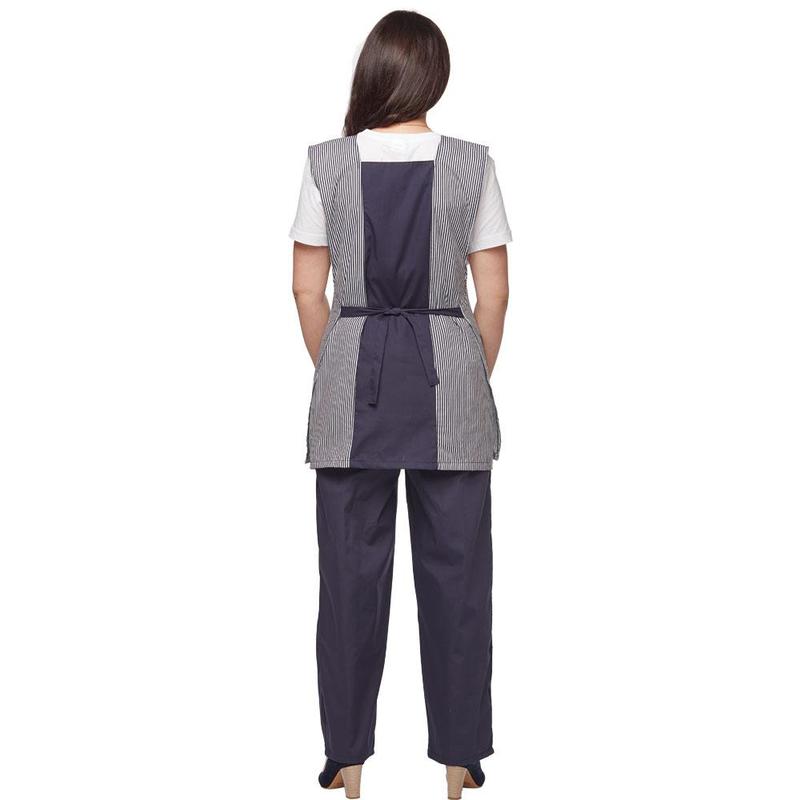 Костюм для горничных и уборщиц у08-СБР, цвет синий (размер 56-58, рост 158-164 см), включает фартук-сарафан и брюки. Фартук с накладными карманами, по талии регулируется боковыми завязками. Отделка — вставки контрастного цвета. Размер накладных карманов — 17x17 см. Брюки умеренного объема на резинке с отстроченной стрелкой. Женский костюм изготовлен из смесовой ткани Ти-Си (65% полиэфир, 35% хлопок). Ти-Си — материал, приятный на ощупь, гигиеничен и долговечен. Не мнется, легко и быстро стирается, быстро сохнет. Долго сохраняет свой первоначальный яркий цвет. Ткань «дышит», благодаря входящему в состав хлопку, имеет повышенный срок службы и проста в уходе, благодаря полиэфиру. Антистатична. Плотность: 120 г/кв. м. Стирать при температуре не выше 40 градусов. Униформа рекомендована для сферы обслуживания, клининга, гостиничного бизнеса.