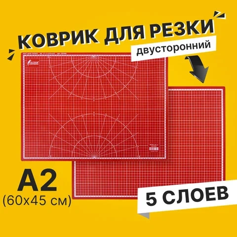 Самовосстанавливающийся мат формата А2 (600х450 мм) выполнен из ПВХ толщиной 3 мм и имеет пятислойную структуру. Все 5 слоев коврика выполнены из высококачественных первичных материалов. Одна сторона коврика имеет разметку в сантиметрах, а другая - такую же сантиметровую разметку с добавлением фигур в виде транспортира.