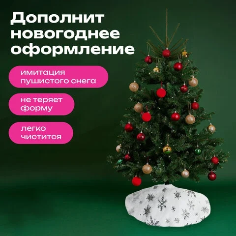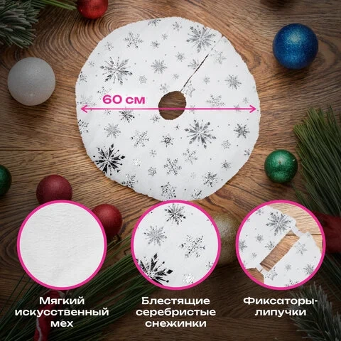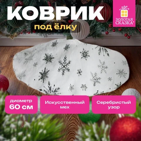 Белоснежный коврик из мягкого полиэстера создаст ощущение зимней сказки прямо у вас дома. Его элегантный дизайн позволит подчеркнуть достоинства вашей елочки: скрыть основание ели и провода от гирлянд.