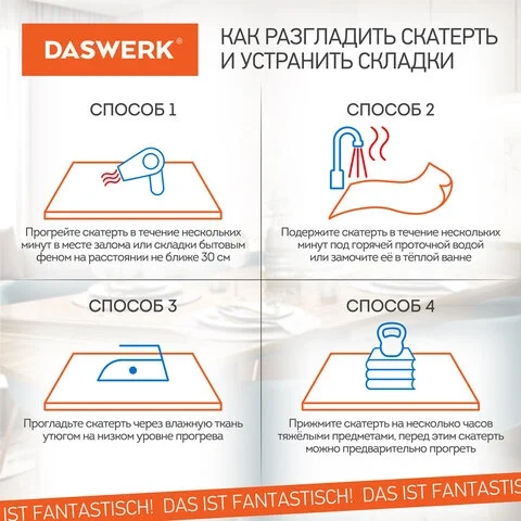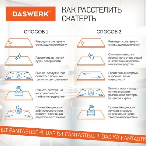 Силиконовая скатерть на стол, также известная как жидкое стекло или гибкое стекло, предназначена для защиты горизонтальных поверхностей от загрязнений и механических повреждений. Благодаря своей толщине 0,5 мм гибкое стекло на стол защищает от царапин, сколов и вмятин. Также скатерть силиконовая не боится пищевых масел и красителей и очень неприхотлива в уходе – жидкое стекло на стол достаточно протереть влажной салфеткой. Скатерть прямоугольная размером 140х60 см расстилается на любую поверхность подходящего размера: в первую очередь, это клеенка на стол на кухню, но также прозрачная пленка подойдет на письменный стол или на детский столик. При необходимости пленка на стол легко нарезается ножницами под нужный размер и форму и подойдёт для подоконника или полки. Также за несколько минут из скатерти клеёнки можно вырезать дорожку на стол или плейсмат меньшего размера. Прозрачная скатерть для стола сохраняет и подчёркивает естественную текстуру камня, дерева, стекла или пластика и впишется в любой интерьер. Свернутая в рулон на картонной втулке скатерть гибкое стекло доставляется в прочной термоусадочной пленке, защищающей от повреждений при транспортировке. Скатерть на кухонный стол DASWERK - это практичное решение для повседневного использования.