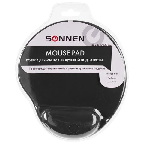 Коврик для мыши с подушкой под запястье SONNEN, полиуретан + лайкра, 250х220х20мм, черный, 513299