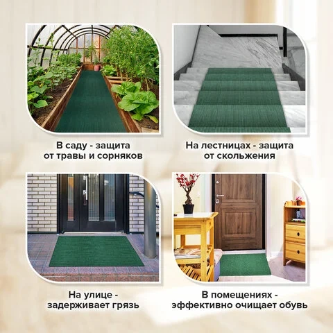 Коврик подходит для использования как внутри помещений, так и на улице. Он не теряет своих свойств при низких температурах, не дубеет и не скользит. Легко очищается с помощью пылесоса или встряхивания. Присохшая грязь смывается струей теплой воды.