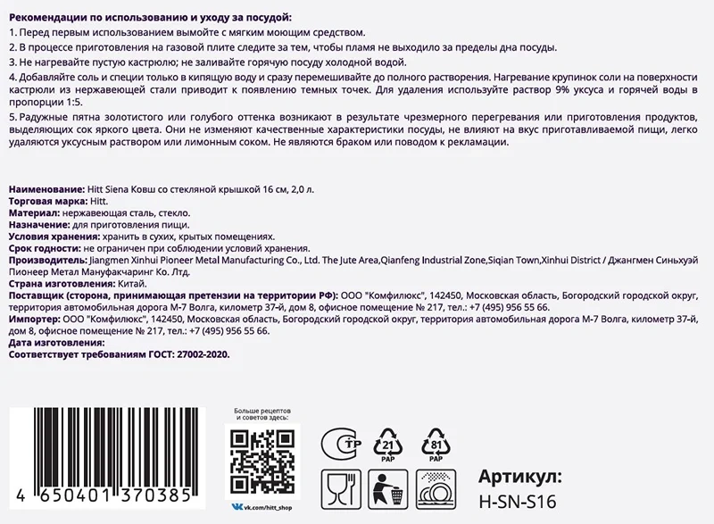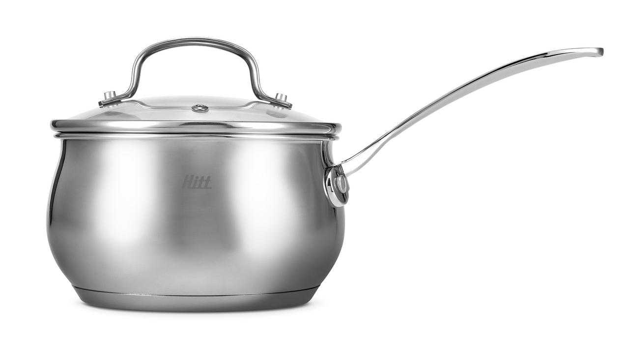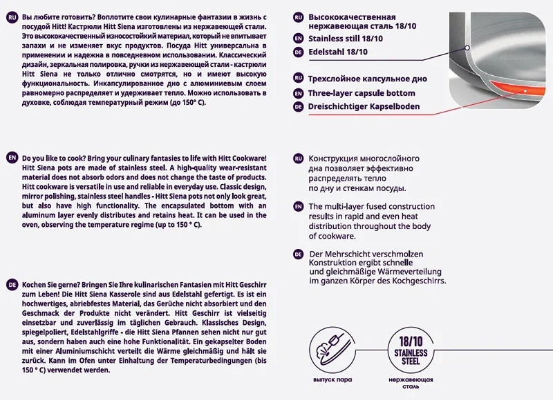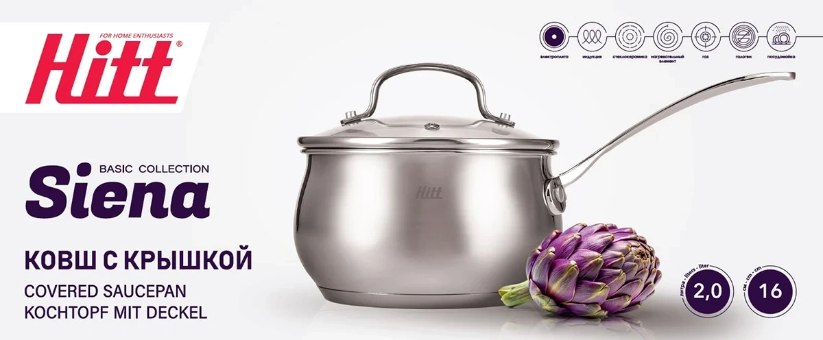 Ковш изготовлен из высококачественной нержавеющей стали. Ковш оснащен капсулированным дном, который обеспечивает равномерное распределение и долгое сохранение тепла блюда. Нержавеющая сталь, из которой изготовлен ковш, устойчива к коррозии и не вступает в реакцию с продуктами, что делает его безопасным для приготовления любых блюд. В комплекте стеклянная крышка с отверстием для выпуска пара и металлическим ободком.