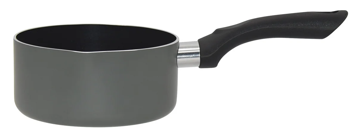 Ковш из алюминия объемом 0,95 литра (D14xH7cm) с антипригарным покрытием. Цвет - серый. Толщина стенок составляет 2,5 мм. Оснащен черным антипригарным покрытием из материала Флюон. Дно типа CD, не предназначено для индукционных плит.