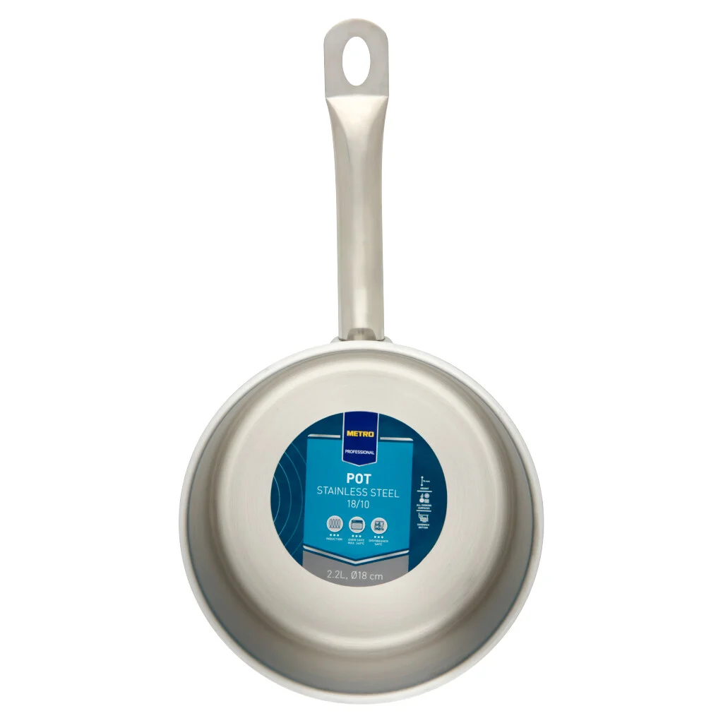 METRO PROFESSIONAL Ковш, 2.2 л, 18 см востребован на любой кухне. В нем можно готовить различные блюда и разогревать продукты. Он совместим с любыми плитами, включая индукционные. Его можно приобрести для профессиональной деятельности и для личного использования в домашних условиях. У ковша классический дизайн. Полированная стальная поверхность выглядит стильно. Длинная ручка исключает контакт с огнем. На ее конце имеется отверстие, что позволяет подвешивать изделие. Ковш изготовлен из нержавеющей стали. Это самый популярный и надежный материал для кухонной посуды. Он обладает антикоррозийными свойствами, способен выдерживать нагрев до высоких температур, не деформируется и устойчив к воздействию внешних факторов (включая агрессивные). Сталь абсолютно безопасна, не впитывает запахов, не выделяет токсичных веществ и не меняет вкусовые качества продуктов. Изделие снабжено антипригарным покрытием, что исключает пригорание пищи и позволяет снизить количество масла и других жиров. Ухаживать за ним легко. Его можно мыть под проточной водой (горячей и холодной). Разрешается использовать различные моющие средства (включая абразивные). При правильном уходе может использоваться долгое время.