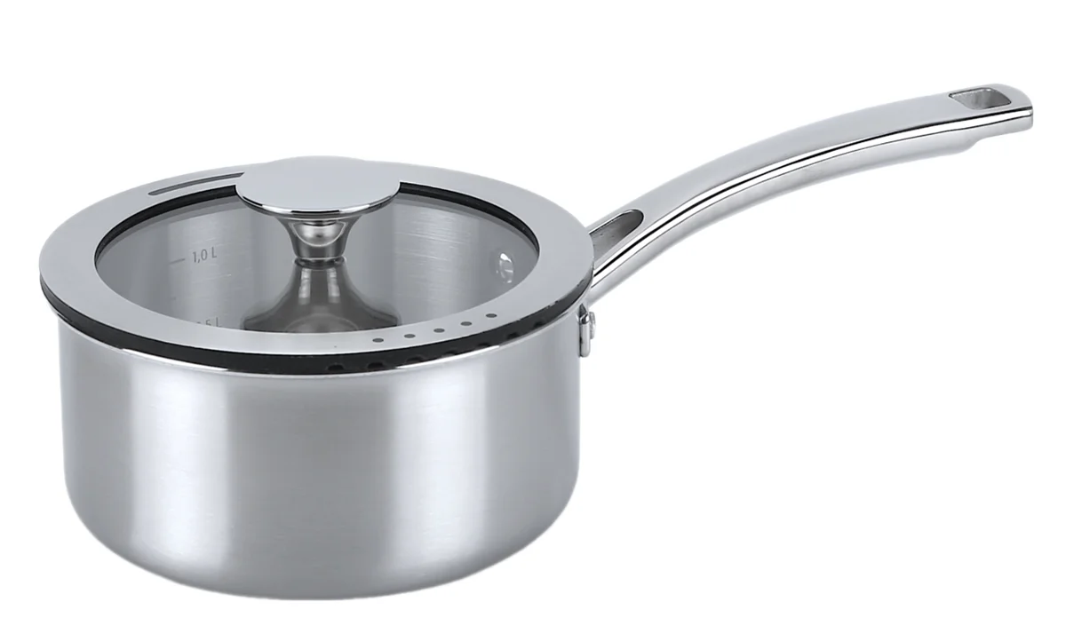 Ковш с крышкой Tri-Ply изготовлен из нержавеющей стали диаметром 16 см и объемом 1,4 литра. Размер изделия: 16x8,5 см. Вес изделия составляет 1,15 кг.