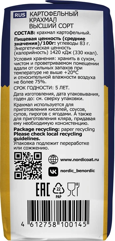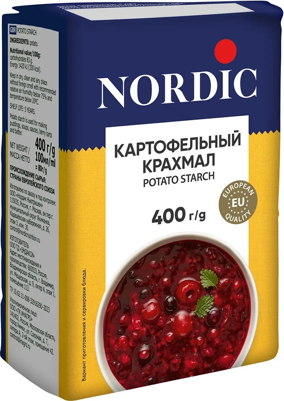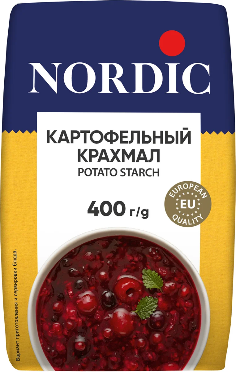 Картофельный крахмал Nordic произведен из финского сырья.При его производстве используется специальный сорт высоко крахмалистого картофеля.Крахмал Nordic обладает стабильным качеством (как ингредиент) и дает всегда ожидаемый результат готового продукта, а также отличается равномерным расходом продукта (хватает на долгое время).Крахмал Nordic высокого оценен как обычными потребителями, так и профессионалами-шеф-поварами.Согласно отзывам потребителей крахмал идеально подходит для использования в домашних условиях для приготовления соусов, варенья, пирогов с ягодами, киселей (кисель остается прозрачным, не мутнеет).Идеален для кляра (придает ему стеклянный вид благодаря чистоте и высокому качеству продукта).