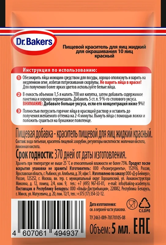 Краситель пищевой Dr.Bakers для яиц жидкий красный, 5мл