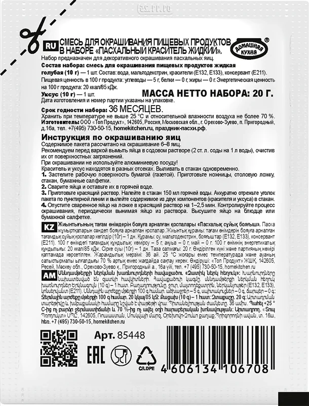 Набор для окрашивания пасхальных яиц с жидким красителем и уксусом. В серии представлено 4 цвета. Краситель удобно использовать - достаточно растворить содержимое пакета в воде. В комплект входит два компонента: краситель и уксус. Одного пакетика хватает для окрашивания 6-8 яиц.