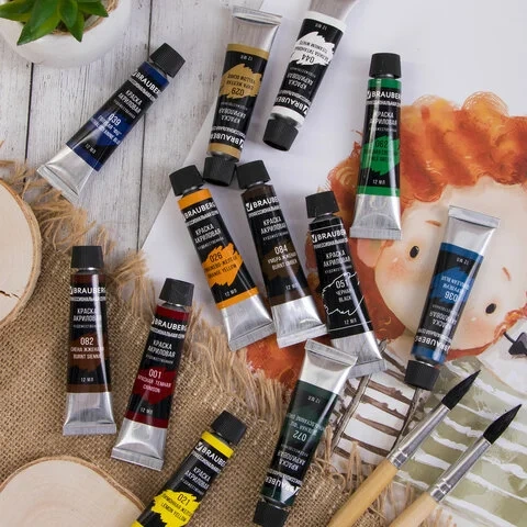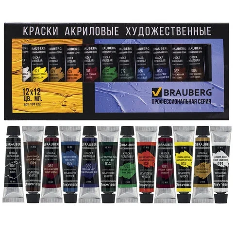 Краска акриловая художественная Brauberg профессиональная серия 12 цветов по 12мл, в тубах