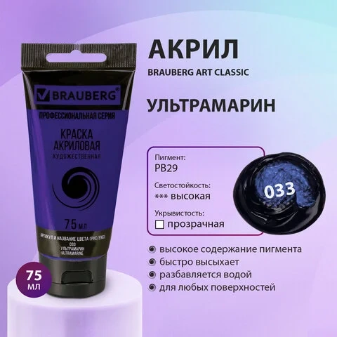 Краска акриловая художественная Brauberg ультрамарин, туба 75мл