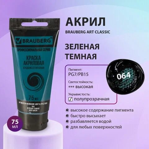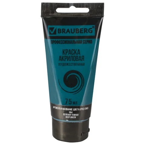 Краска акриловая художественная Brauberg зеленая темная, туба 75мл