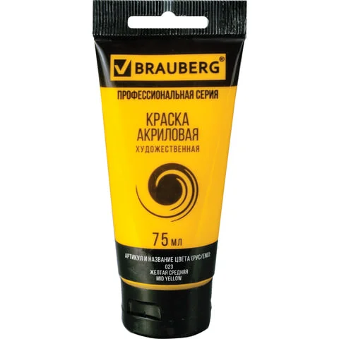 Краска акриловая художественная Brauberg желтая, туба 75мл