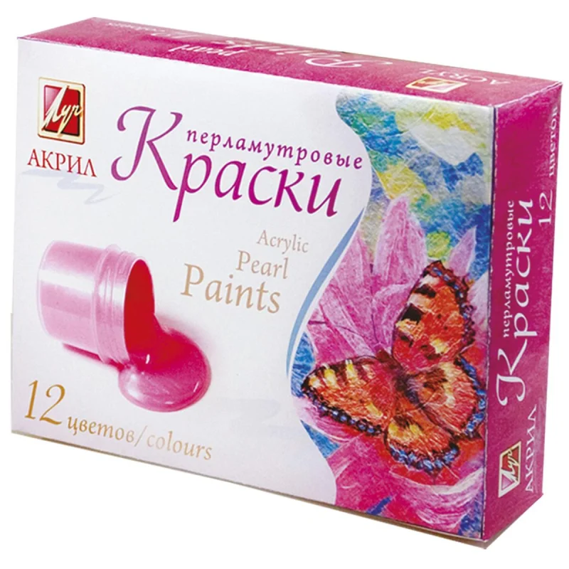 Акриловые краски прекрасно подходят для художественных, декоративных и дизайнерских работ. Как и акварель, акрил легко разбавляются водой, но после высыхания его уже нельзя размочить, так как краска образует несмываемую пленку. Красочный слой эластичен, прочен и долговечен. Красками можно работать практически на любой поверхности. В набор входит 12 цветов — лимонный перламутровый, розовый перламутровый, красный перламутровый, голубой перламутровый, изумрудный перламутровый, черный перламутровый, белый перламутровый, фиолетовый перламутровый, оранжевый перламутровый, коричневый перламутровый, сиреневый перламутровый, зеленый перламутровый.