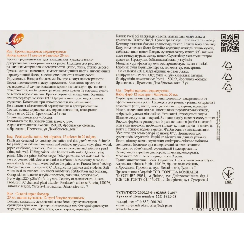 Краски акриловые Луч набор 12 цветов по 20 мл перламутровые