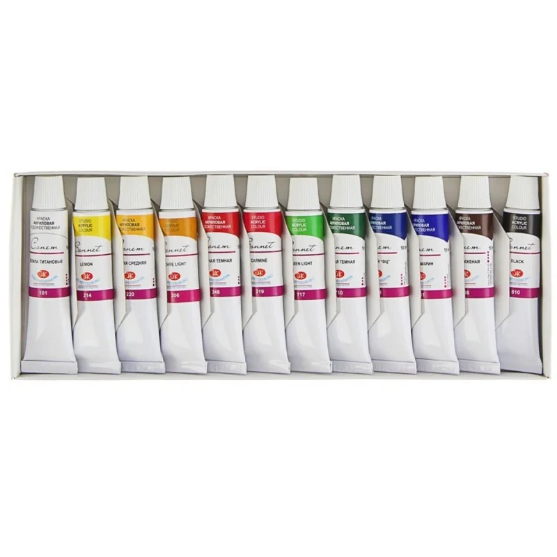 Сбалансированная палитра в наборе акриловых красок Сонет состоит из 12 цветов, необходимых начинающему художнику для выполнения учебных работ, этюдов и эскизов.