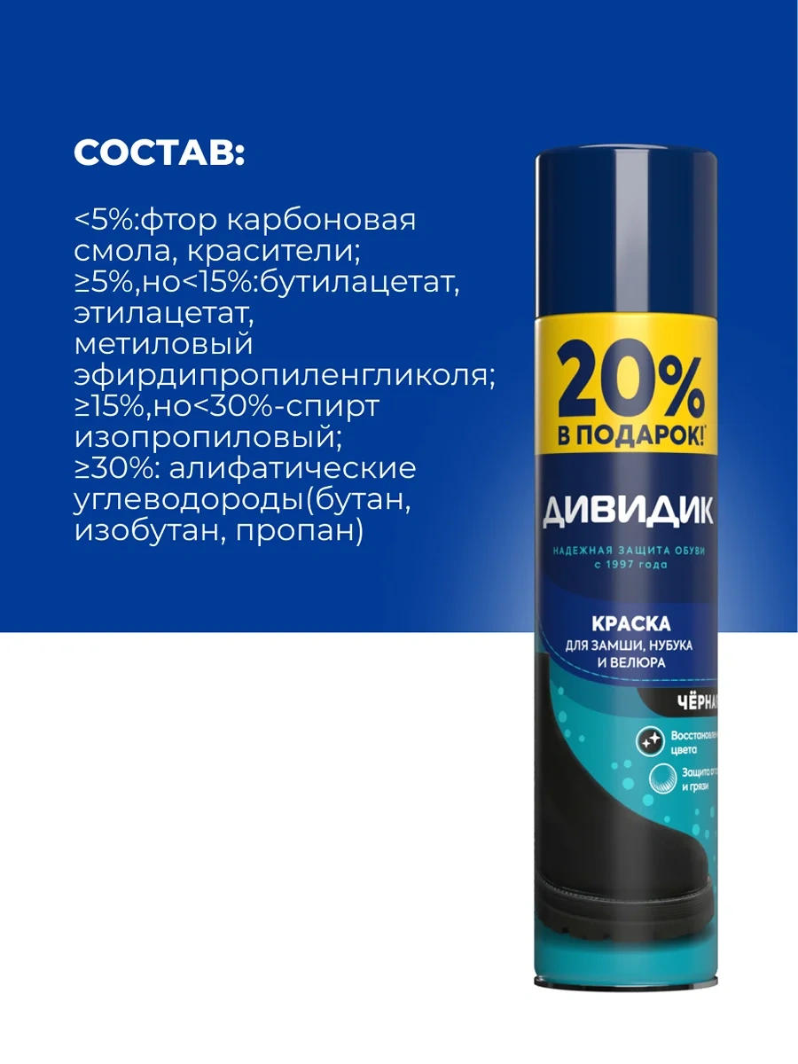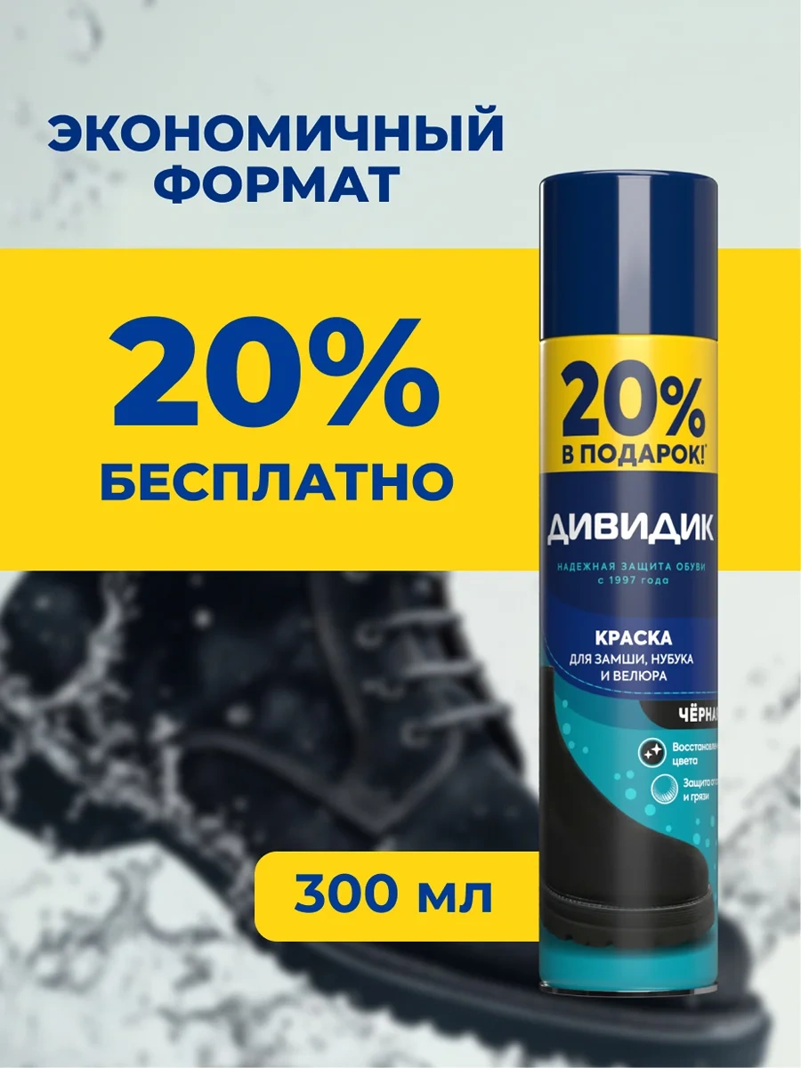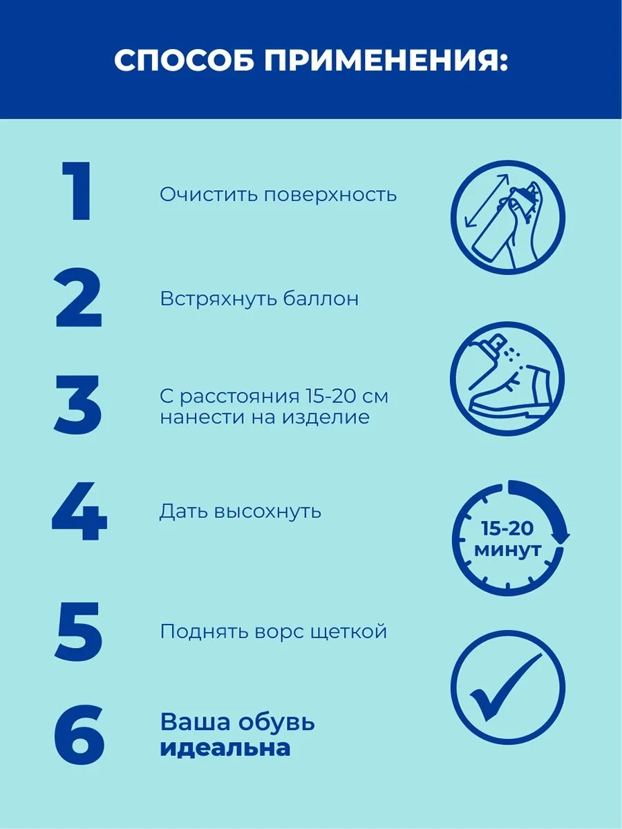 Очистите поверхность обуви. Обратите внимание, что для каждого материала свои правила очистки. Встряхните баллончик с краской для замши, нубука и велюра ДИВИДИК в течение 3-5 секунд. Перед использованием рекомендуется испытать на незаметном участке изделия! Равномерно нанесите средство на поверхность обуви с расстояния 15-20 см. Старайтесь держать баллон вертикально во время использования. Дайте обуви просохнуть в течение 20 минут. При необходимости повторите обработку. После высыхания поднимите ворс щеткой.