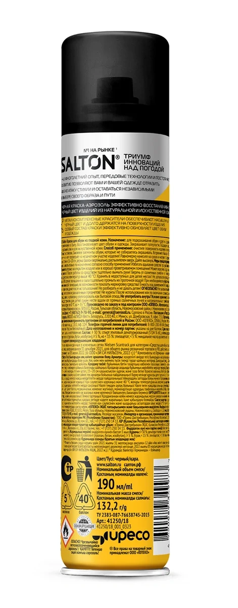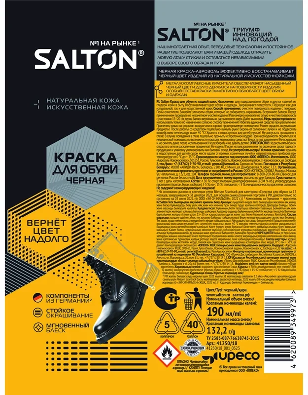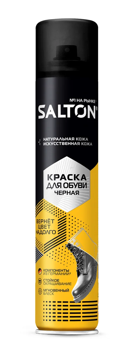 Изделия из черной кожи являются классикой и никогда не выходят из моды, однако этот материал более всего подвержен выгоранию и заметнее всего тускнеет под воздействием влаги и других внешних факторов. Также на черной коже лучше всего заметны механические повреждения. Обновить черный цвет кожи, а также эффективно закрасить дефекты поможет краска для гладкой кожи Salton. Это средство для обуви в виде спрея обеспечивает стойкое равномерное окрашивание черной кожи. Краска для кожи восстанавливает внешний вид обуви: закрашивает потертости и царапины, освежает цвет изделия. Краска для обуви черная от Salton подходит для окрашивания черной обуви, а также сумок, курток, ремней и других изделий из гладкой кожи. Краска также подходит для обработки искусственных кож. Краска в виде спрея удобно и быстро наносится на изделие. Подарите Вашим черным кожаным вещам вторую жизнь с краской Salton. Перед применением проверьте на незаметном участке изделия.