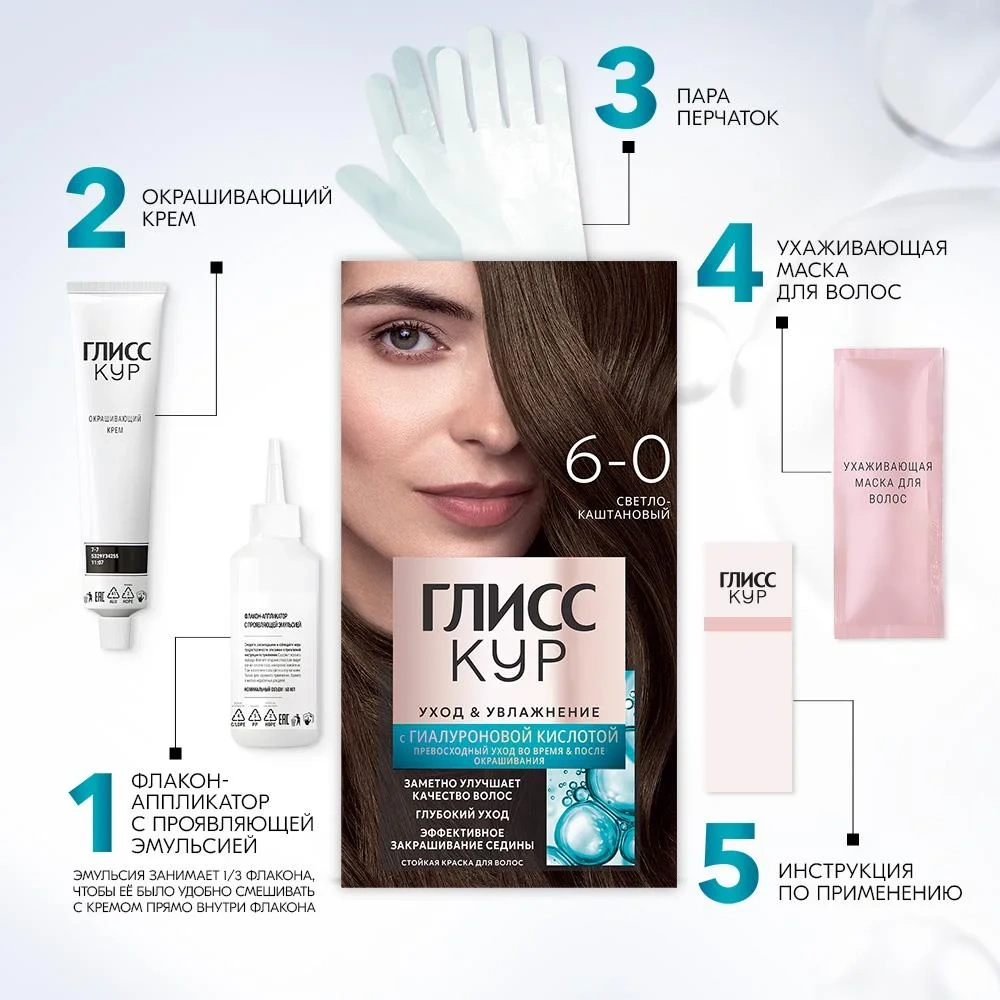 Стойкая краска для волос Глисс Кур Уход и Увлажнение с гиалуроновой кислотой 6-0 Светло-каштановый. Превосходный уход во время и после окрашивания. - Заметно улучшает качество волос. - Интенсивный цвет + 100% закрашивание седины. Формула c системой color care delivery глубоко проникает в структуру волоса. Наша стойкая краска c гиалуроновой кислотой, известной своими увлажняющими свойствами, не только защищает волосы, но и ухаживает за ними во время и после окрашивания. Результат: глубокий уход и насыщенный стойкий цвет.