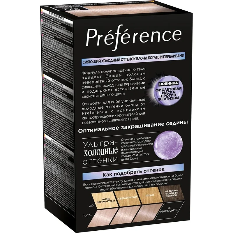 Стойкая краска для волос Preference - премиальное качество окрашивания! Она создана ведущими экспертами лабораторий Лореаль Париж в сотрудничестве с профессиональным колористом Кристофом Робином. В результате исследований был разработан уникальный состав краски, основанный на более объемных красящих пигментах. Стойкая краска способна дольше удерживаться в структуре волос, создавая неповторимый яркий цвет, устойчивый к вымыванию и возникновению тусклости. Комплекс Экстраблеск добавит блеска насыщенному цвету волос. Красивые шелковые волосы с насыщенным цветом на протяжении 8 недель после окрашивания! Новая гамма оттенков Preference Cool Blondes – это ультра-пепельные блонд-оттенки и новая маска с фиолетовой технологией для поддержания холодного оттенка без желтизны до следующего окрашивания! Уникальная фиолетовая маска нейтрализует желтизну до 6 недель после окрашивания, а благодаря большому объему позволяет сохранить желанный холодный оттенок надолго! Оттенок 9.12 вдохновлен Сибирью, ледяным бриллиантом Дальнего Востока. Такой же кристальный и захватывающий, как бескрайние ледяные просторы, этот невероятно светлый пепельно-бежевый блонд идеально подходит для создания изысканного образа.